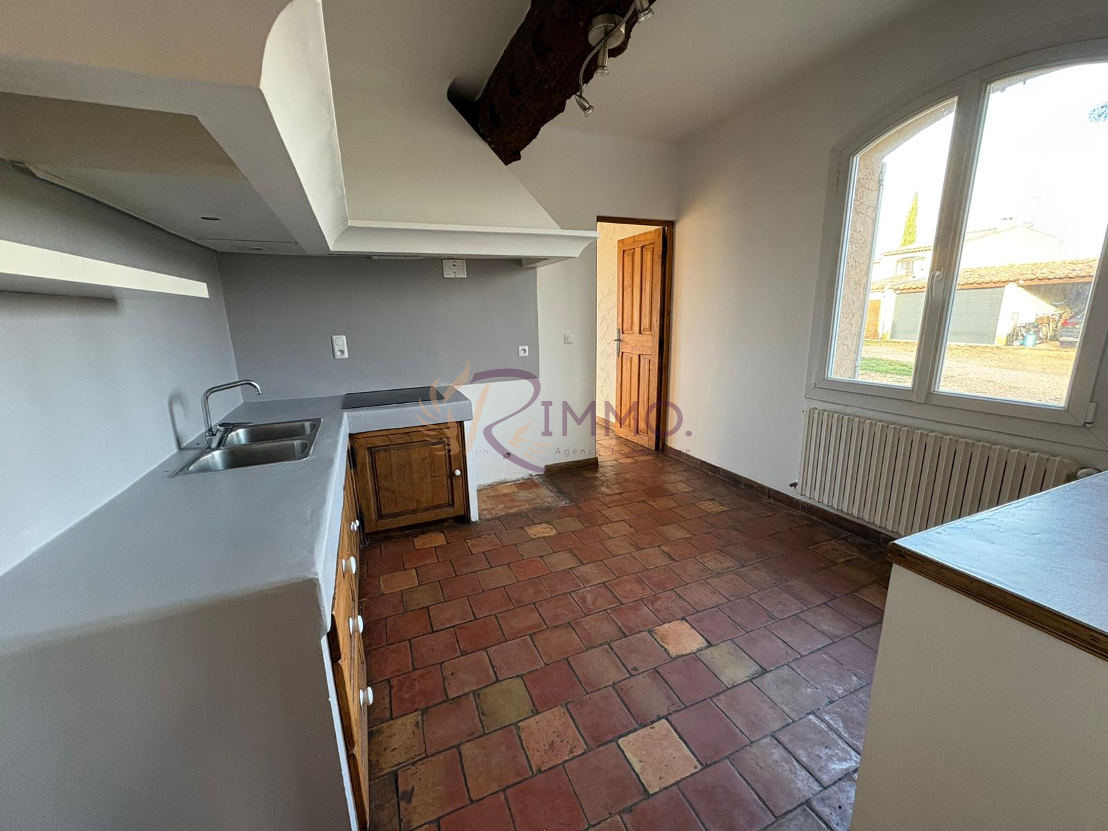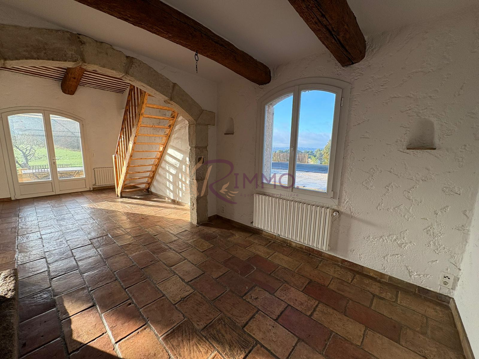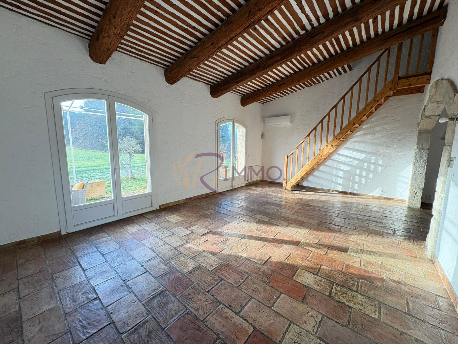 Vous découvrirez un hall d’entrée avec rangements, une cuisine séparée et semi-équipée (hotte, plaque, évier, nombreux rangements), et un grand séjour lumineux, équipé de climatisation, avec une belle hauteur sous plafond et une vue dégagée sur le jardin.